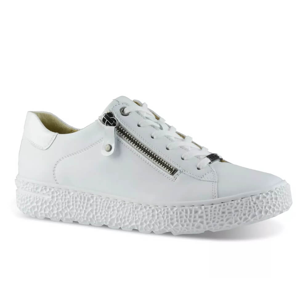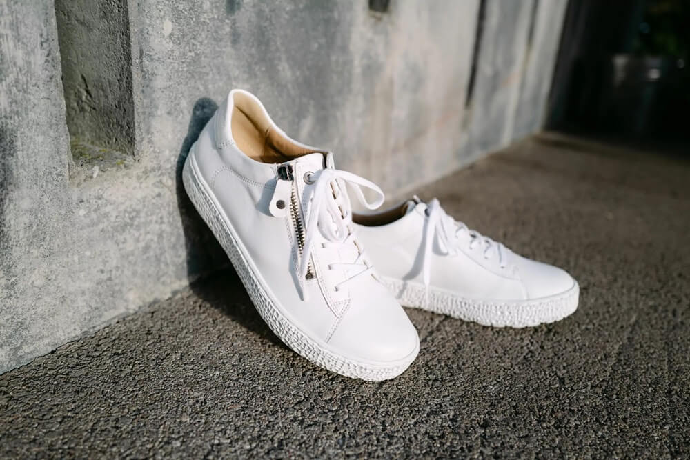 Skon är utrustad med både snörning och dragkedja, vilket gör den smidig att ta på och av. Den mjuka ovandelen formar sig efter foten och tillsammans med den vita, fräscha färgen ger skon ett lätt och modernt intryck.