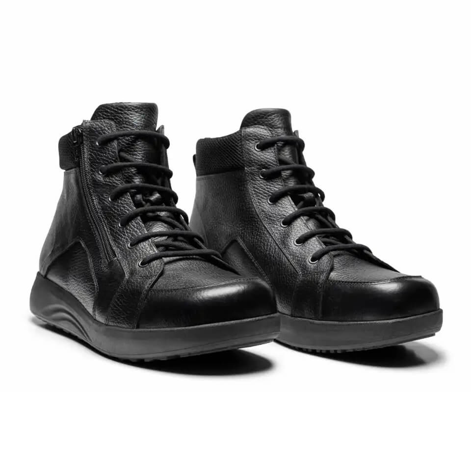 Adam är ett par stilrena och funktionella herrkängor i svart kalvskinn designade för maximal komfort. Med mjukt filtfoder, vattenavvisande membran och bred läst är dessa kängor ett ovärderligt val både för vardag och mer aktivt bruk.