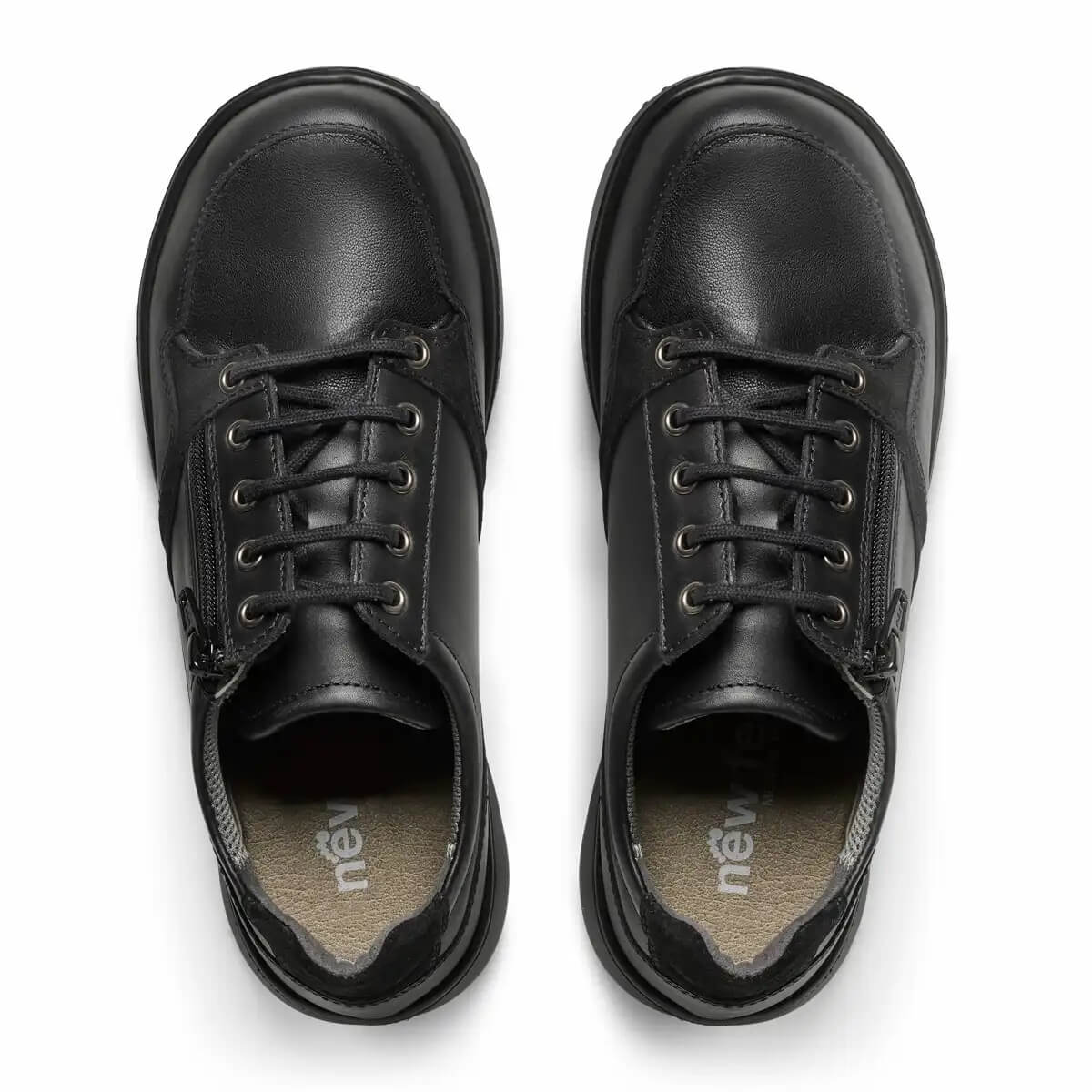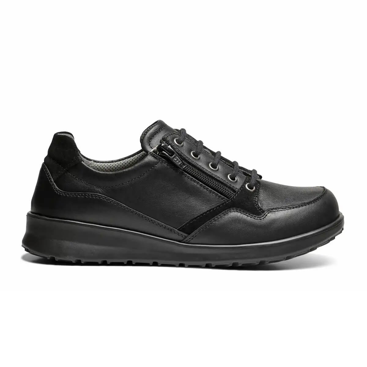 Skon har traditionell snörning som gör att passformen enkelt kan justeras efter foten. Den praktiska dragkedjan på sidan gör det samtidigt smidigt att ta av och på skon utan att behöva knyta upp snörena varje gång.