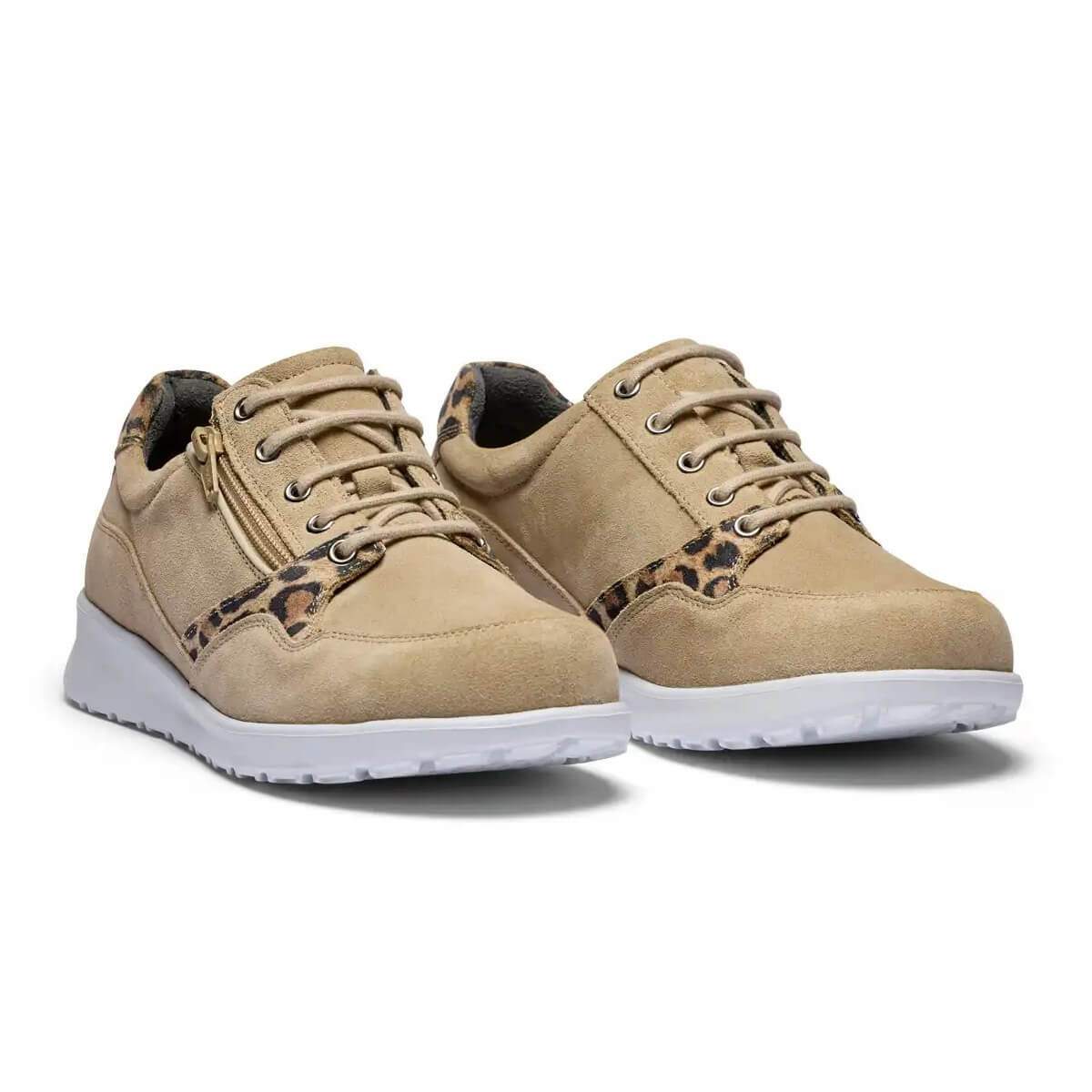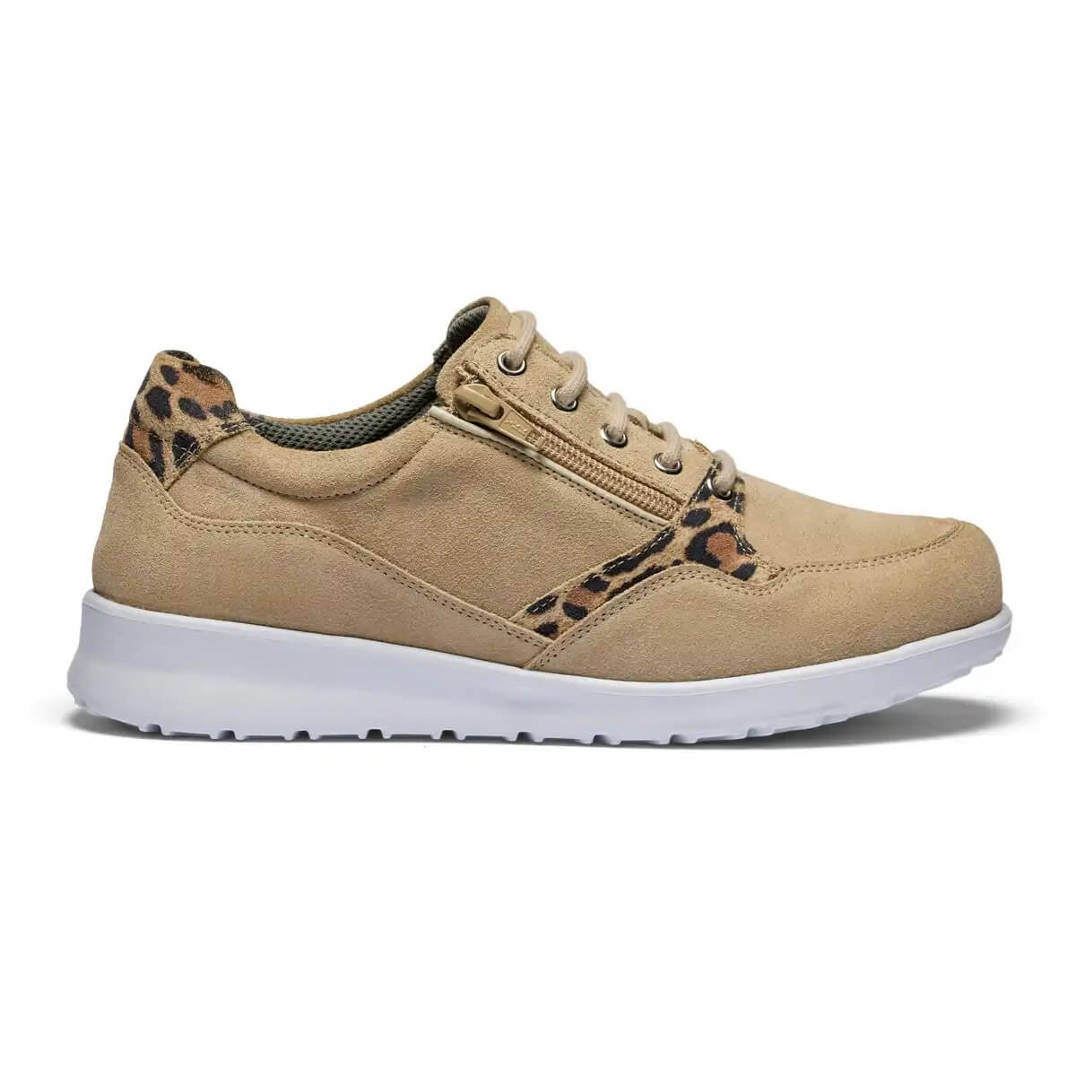 Skon har traditionell snörning som gör att passformen enkelt kan justeras efter foten. Den praktiska dragkedjan på sidan gör det samtidigt smidigt att ta av och på skon utan att behöva knyta upp snörena varje gång.